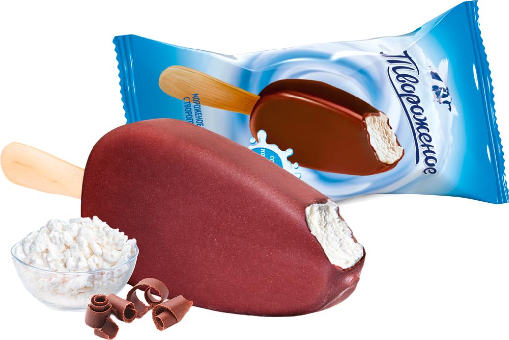 молоко питьевое, творог обезжиренный (обезжиренное молоко, закваска), вода питьевая, сахар, масло сливочное, сухой глюкозный сироп, молоко сухое цельное, эмульгатор (моно- и диглицериды жирных кислот), стабилизаторы (камедь рожкового дерева, гуаровая камедь, каррагинан). Глазурь с растительным жиром (для мороженого) с ароматом клубники: масло кокосовое рафинированное дезодорированное, сахар, молоко сухое обезжиренное, эмульгатор соевый лецитин, ароматизатор пищевой «Клубника», красители кармины; Может содержать следы орехов, арахиса, яичных продуктов, глютена