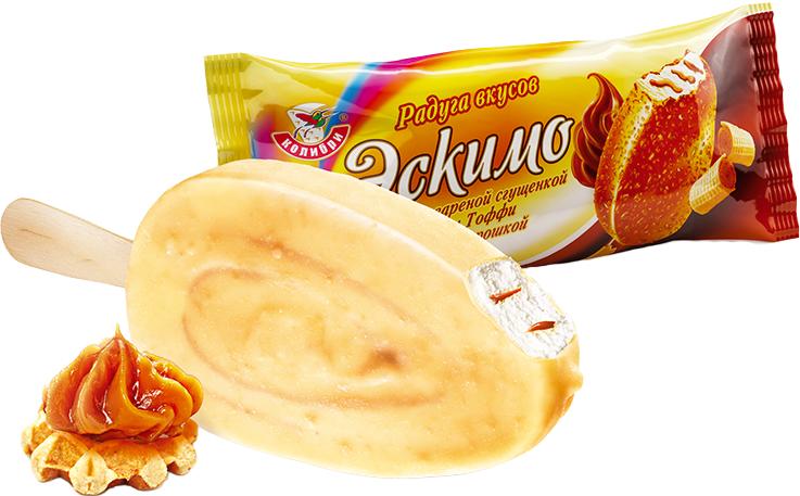 СОДЕРЖИТ РАСТИТЕЛЬНЫЕ МАСЛА восстановленное молоко (вода питьевая, молоко сухое обезжиренное), сахар, масло сливочное, заменитель молочного жира (рапсовое масло, кокосовое масло), вода питьевая, сыворотка молочная сухая, эмульгатор (моно-и диглицериды жирных кислот), стабилизаторы (гуаровая камедь, карбоксиметилцеллюлоза натриевая соль, каррагинан), ароматизатор пищевой «Ванилин»; Глазурь белая с ароматом «Тоффи» с растительным жиром (для мороженого): масло кокосовое рафинированное дезодорирванное, сахар, молоко сухое обезжиреное, эмульгатор соевый лецитин, ароматизатор пищевой «Тоффи», краситель бета-каротин; Вафельная крошка: мука пшеничная х/п 1, сахар, масло кокосовое рафинированное, дезодорированное, эмульгатор соевый лецитин. Крем кондитерский «Вареная сгущенка»: сахар, вода питьевая, молоко сухое обезжиренное, заменитель молочного жира(смотрите выше), сыворотка молочная сухая, пищевая добавка стабилизатор СМ-110(цитрат калия, тартраты натрия, декстроза, мальтодекстрин, эфиры глицерина), пищевая добавка-уплотнитель хлористый кальций, ароматизатор пищевой «Вареная сгущенка». Может содержать следы орехов, арахиса, яичных продуктов