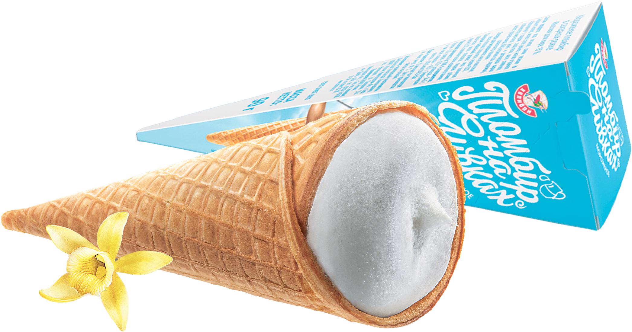 восстановленное молоко (вода питьевая, молоко сухое цельное, молоко сухое обезжиренное, сливки питьевые, вода питьевая, сахар, молоко сгущённое с сахаром из восстановленного обезжиренного молока (восстановленное обезжиренное молоко, сахар (сахароза)), масло сливочное, эмульгатор (моно- и диглицериды жирных кислот), стабилизаторы (гуаровая камедь, карбоксиметилцеллюлоза натриевая соль, каррагинан), ароматизатор пищевой «Ванилин»; Вафельный сахарный рожок: мука пшеничная х/п 1с, сахар, масло кокосовое рафинированное дезодорированное, эмульгатор соевый лецитин, пищевые волокна (клетчатка), ароматизатор пищевой "Ванилин"; Шоколадная глазурь с растительным жиром (для мороженого): масло кокосовое рафинированное дезодорированное, сахар, какао-порошок, эмульгатор пищевая добавка соевый лецитин, ароматизатор пищевой "Ванилин». Может содержать следы орехов, арахиса, яичных продуктов