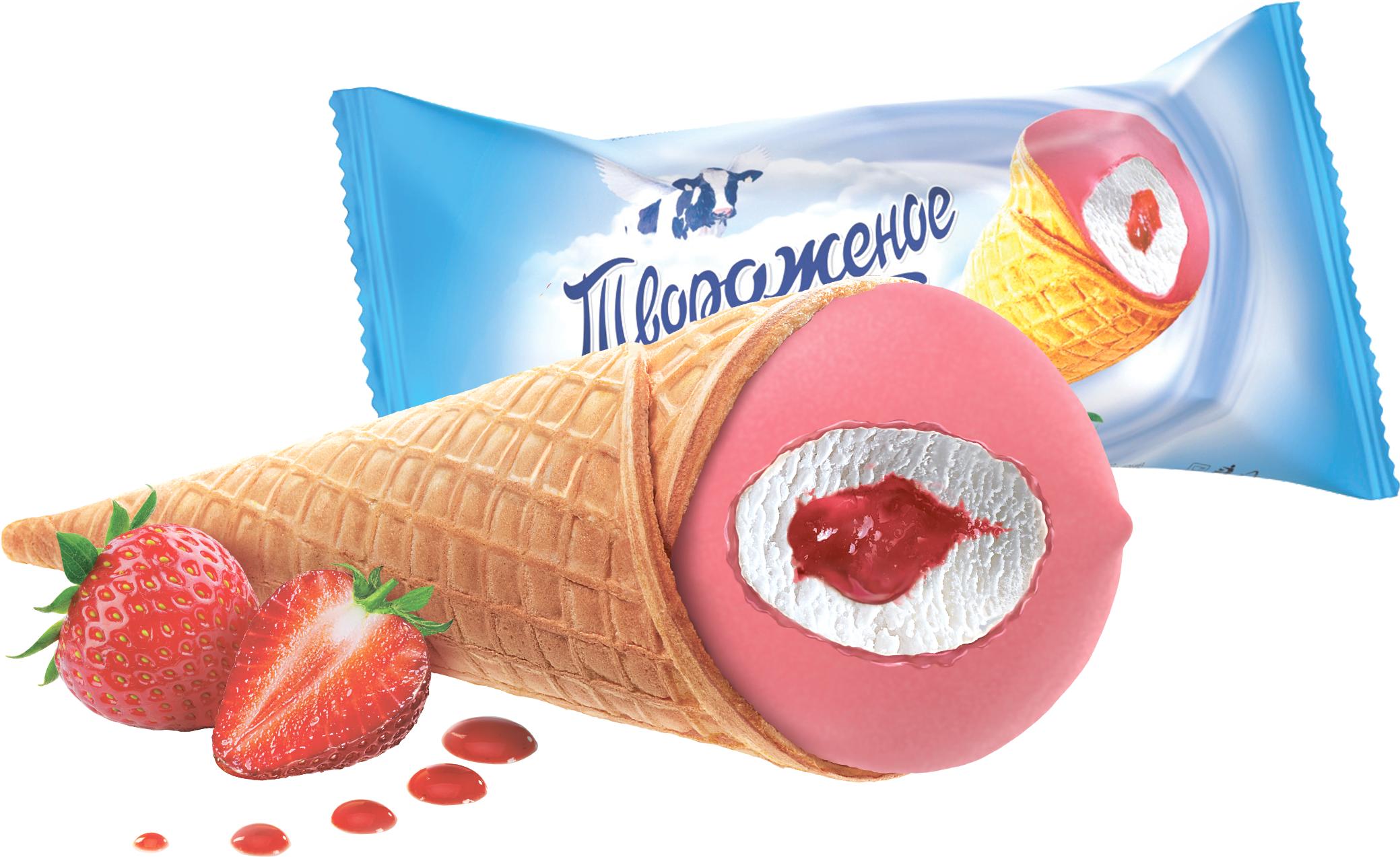 молоко питьевое, творог обезжиренный (обезжиренное молоко, закваска), вода питьевая, сахар, масло сливочное, сухой глюкозный сироп, молоко сухое цельное, эмульгатор (моно- и диглицериды жирных кислот), стабилизаторы (камедь рожкового дерева, гуаровая камедь, каррагинан). Фруктово-ягодный наполнитель клубника: сахар, вода, клубника, яблоко, стабилизатор пектины, регуляторы кислотности кислота лимонная, цитрат натрия, краситель кармины, ароматизатор пищевой «Клубника» Вафельный сахарный рожок: мука пшеничная х/п 1с, сахар, масло кокосовое рафинированное дезодорированное, эмульгатор соевый лецитин, пищевые волокна (клетчатка), ароматизатор пищевой "Ванилин"; Глазурь с растительным жиром (для мороженого) с ароматом клубники: масло кокосовое рафинированное дезодорированное, сахар, молоко сухое обезжиренное, эмульгатор соевый лецитин, ароматизатор пищевой «Клубника», красители кармины; Может содержать следы орехов, арахиса, яичных продуктов