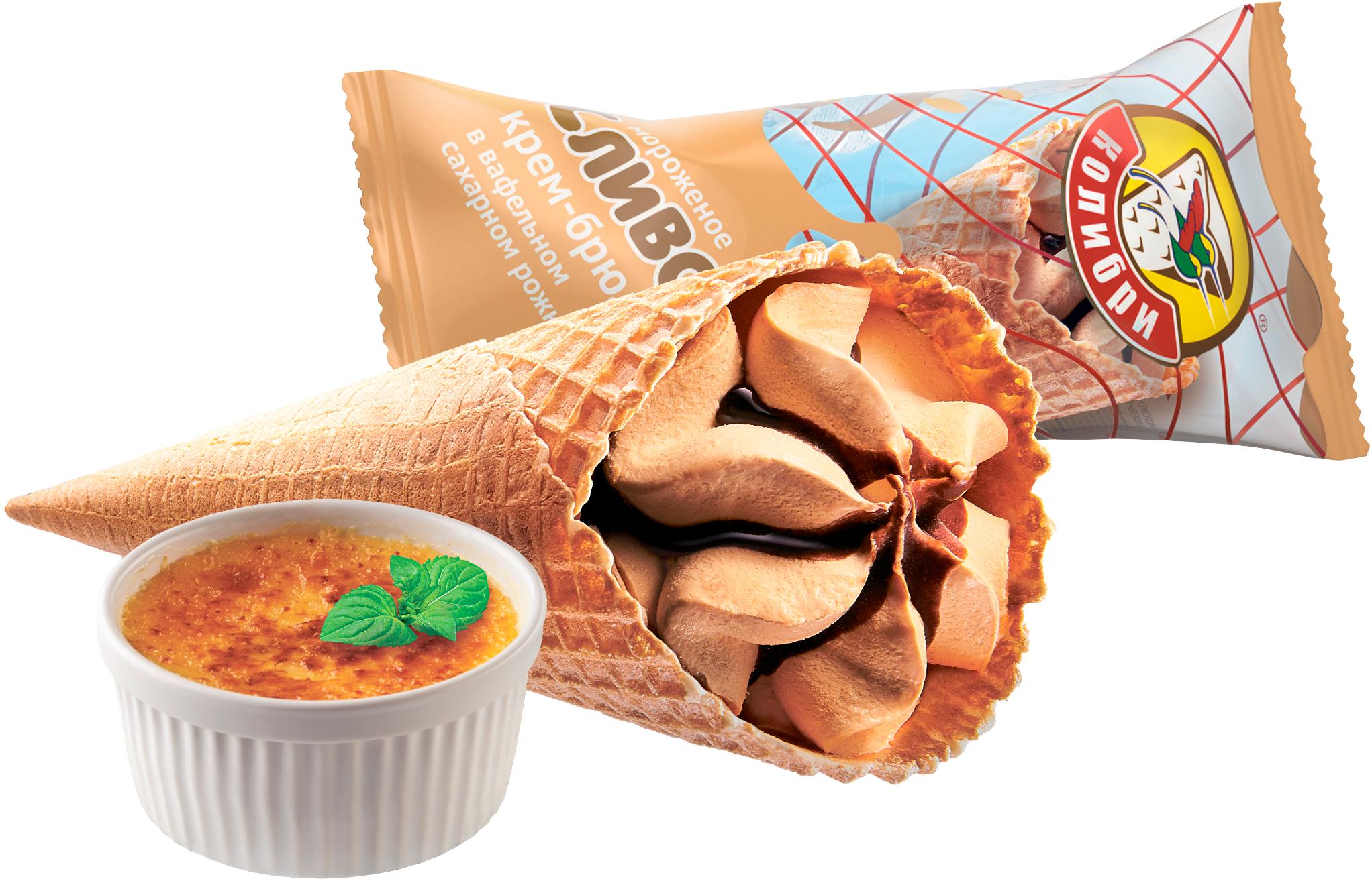 восстановленное молоко (вода питьевая, молоко сухое цельное, молоко сухое обезжиренное), сироп крем-брюле (молоко сгущённое с сахаром из восстановленного обезжиренного молока (восстановленное обезжиренное молоко, сахар (сахароза)), сахар, вода питьевая), масло сливочное, сахар, молоко сгущённое с сахаром из восстановленного обезжиренного молока (см. состав выше), эмульгатор (моно- и диглицериды жирных кислот), стабилизаторы (гуаровая камедь, карбоксиметилцеллюлоза натриевая соль, каррагинан), ароматизатор пищевой «Крем-брюле»; Вафельный сахарный рожок: мука пшеничная х/п 1с, сахар, масло кокосовое рафинированное дезодорированное, эмульгатор соевый лецитин, пищевые волокна (клетчатка), ароматизатор пищевой "Ванилин"; Шоколадная глазурь с растительным жиром (для мороженого): масло кокосовое рафинированное дезодорированное, сахар, какао-порошок, эмульгатор соевый лецитин, ароматизатор пищевой «Ванилин». Может содержать следы орехов, арахиса, яичных продуктов