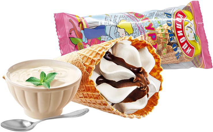 СОДЕРЖИТ РАСТИТЕЛЬНЫЕ МАСЛА восстановленное молоко (вода питьевая, молоко сухое обезжиренное), сахар, масло сливочное, заменитель молочного жира (рапсовое масло, кокосовое масло), сыворотка молочная сухая, эмульгатор (моно-и диглицериды жирных кислот), стабилизаторы (гуаровая камедь, карбоксиметилцеллюлоза натриевая соль, каррагинан), пищевая добавка «Йогрут»; Вафельный сахарный рожок: мука пшеничная х/п 1с, сахар, масло кокосовое рафинированное дезодорированное, эмульгатор соевый лецитин, пищевые волокна (клетчатка), ароматизатор пищевой "Ванилин"; Шоколадная глазурь с растительным жиром (для мороженого): масло кокосовое рафинированное дезодорированное, сахар, какао-порошок, эмульгатор соевый лецитин, ароматизатор пищевой «Ванилин». Может содержать следы орехов, арахиса, яичных продуктов