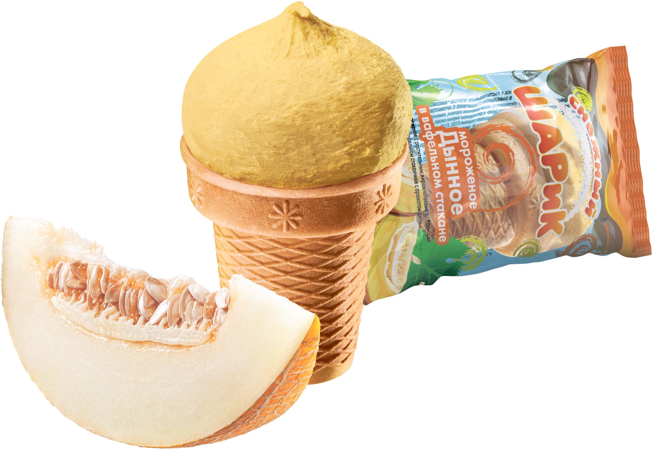 СОДЕРЖИТ РАСТИТЕЛЬНЫЕ МАСЛА восстановленное молоко (вода питьевая, молоко сухое обезжиренное), сахар, масло сливочное, заменитель молочного жира (рапсовое масло, кокосовое масло), вода питьевая, сыворотка молочная сухая, эмульгатор (моно-и диглицериды жирных кислот), стабилизаторы (гуаровая камедь, карбоксиметилцеллюлоза натриевая соль, каррагинан), ароматизатор пищевой «Дыня», краситель пищевой натуральный «Аннато»; Вафельный стаканчик: мука пшеничная х/п в/с, крахмал картофельный, масло кокосовое рафинированное дезодорированное, эмульгатор соевый лецитин, разрыхлитель гидрокарбонат натрия, соль пищевая. Может содержать следы орехов, арахиса, яичных продукто