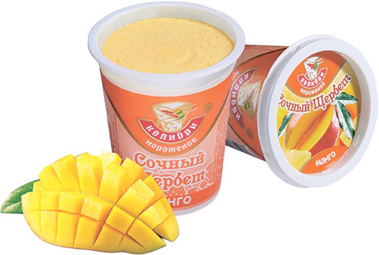 восстановленное молоко (вода питьевая, молоко сухое цельное, молоко сухое обезжиренное), масло сливочное, сахар, молоко сгущённое с сахаром из восстановленного обезжиренного молока (восстановленное обезжиренное молоко, сахар (сахароза)), эмульгатор (моно- и диглицериды жирных кислот), стабилизаторы (гуаровая камедь, карбоксиметилцеллюлоза натриевая соль, каррагинан), ароматизатор пищевой «Ванилин». Фруктовый сорбет манго: вода питьевая, пюре манго, сахар, глюкозный сироп, стабилизаторы (камедь плодов рожкового дерева, гуаровая камедь). Может содержать следы орехов, арахиса, яичных продуктов, сои, глютена